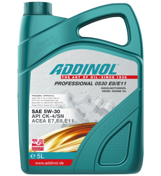 ADDINOL Professional 0530 E8/E11 — масло для дизельных двигателей класса SAE 5W-30, отвечающее экстремальным требованиям к моторным маслам строгих стандартов выбросов Euro V и Euro VI.