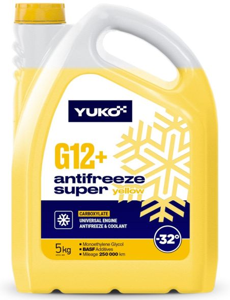Yuko Antifreeze Super G12+ — готовая к применению высококачественная охлаждающая жидкость жёлтого цвета для современных бензиновых и дизельных двигателей, включая двигатели, изготовленные из лёгких металлов. Обеспечивает эффективный теплоотвод, надёжную защиту от коррозии и стабильную работу системы охлаждения в различных сезонных и климатических условиях.