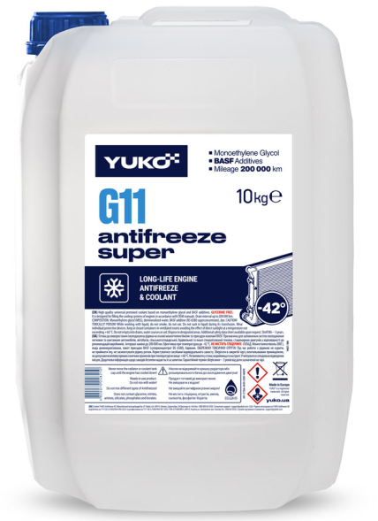 Yuko Antifreeze Super G11 (−42C, синий) — высококачественная охлаждающая жидкость для современных бензиновых и дизельных двигателей, включая двигатели из лёгких металлов, эксплуатируемых в различных сезонных и климатических условиях. Обеспечивает надёжную защиту от замерзания, перегрева, коррозии и образования вредных отложений, эффективно защищая детали двигателя из чугуна, алюминия, меди и стали. Изготовлена на основе моноэтиленгликоля и специальных антикоррозионных присадок BASF. Не содержит глицерина!