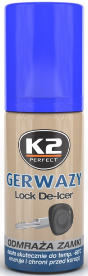 K2 Gerwazy — эффективное средство для быстрого размораживания автомобильных замков. Мгновенно проникает в механизм, устраняет лёд даже при температуре до −60°C, создаёт защитный слой от повторного замерзания и защищает от коррозии.
