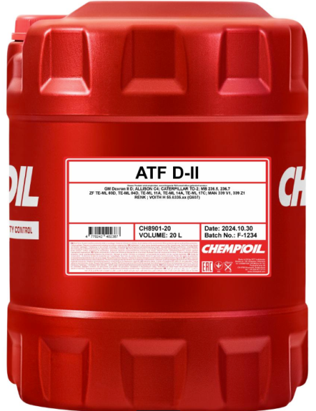 Chempioil ATF D-II - универсальное всесезонное масло, предназначенное для использования в автоматических коробках передач, гидравлических системах рулевого управления и гидравлических сцеплениях автомобилей. Обладает высокими эксплуатационными характеристиками. Обеспечивает долговечность деталей трансмиссии.