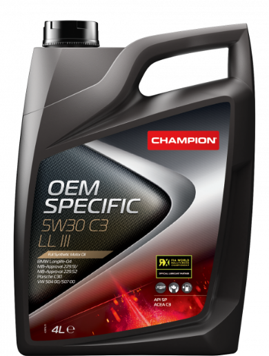 Champion OEM Specific 5W-30 C3 LL III 4L — полностью синтетическое моторное масло, разработанное для современных бензиновых и дизельных двигателей, включая турбированные и оснащённые системами очистки выхлопа (DPF).