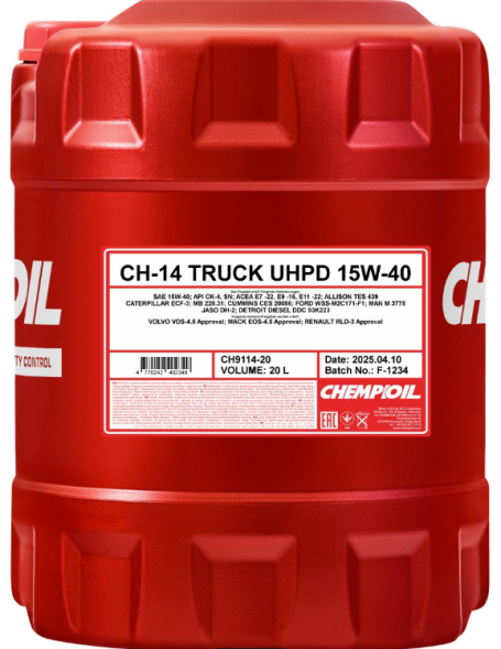 Chempioil CH-14 Truck UHPD 15W-40 — всесезонное синтетическое моторное масло для высоконагруженных дизельных двигателей грузовых автомобилей, автобусов и спецтехники. Подходит для двигателей с турбонаддувом и без него, работающих в тяжелых условиях эксплуатации и соответствующих современным экологическим требованиям. Обеспечивает надежную защиту от износа, стабильную работу двигателя и поддерживает его чистоту при высоких нагрузках.