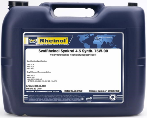 Rheinol Synkrol 4.5 Synth. 75W-90 — полностью синтетическое трансмиссионное масло для механических коробок передач, редукторов и мостов. Подходит для легковых, грузовых автомобилей и спецтехники. Обеспечивает надежную защиту от износа, легкое переключение передач и стабильную работу при высоких нагрузках и широком диапазоне температур. Соответствует требованиям API GL-4/GL-5.